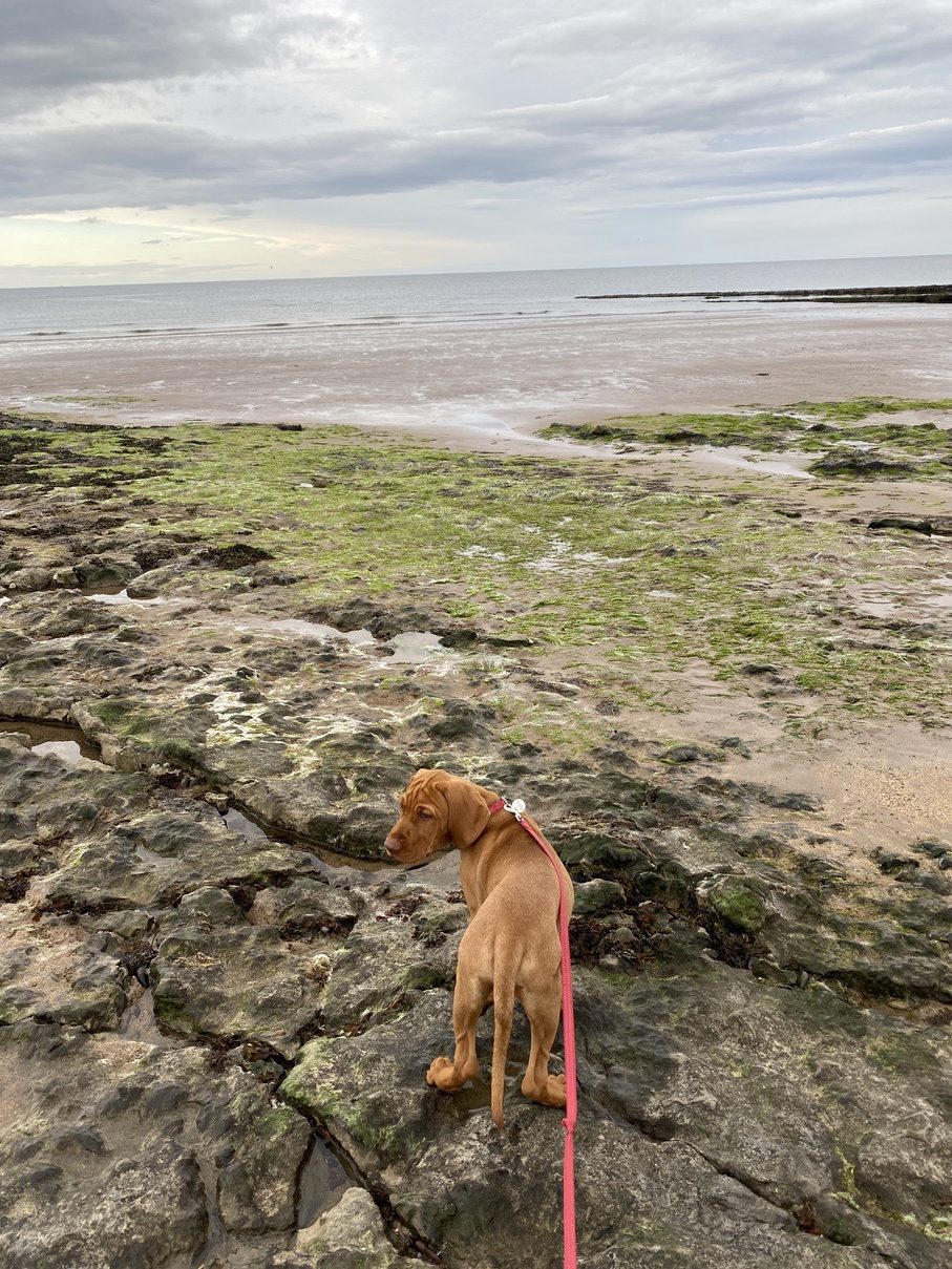 We visited the harbour around Dunbar, and also Cocklawburn Beach in Northumberland. At Dunbar, being in the town Fergus remained on the lead, getting used to all the new sights and sounds. At Cocklawburn Beach he started on the lead, but we moved to no lead quickly as it was very safe.
