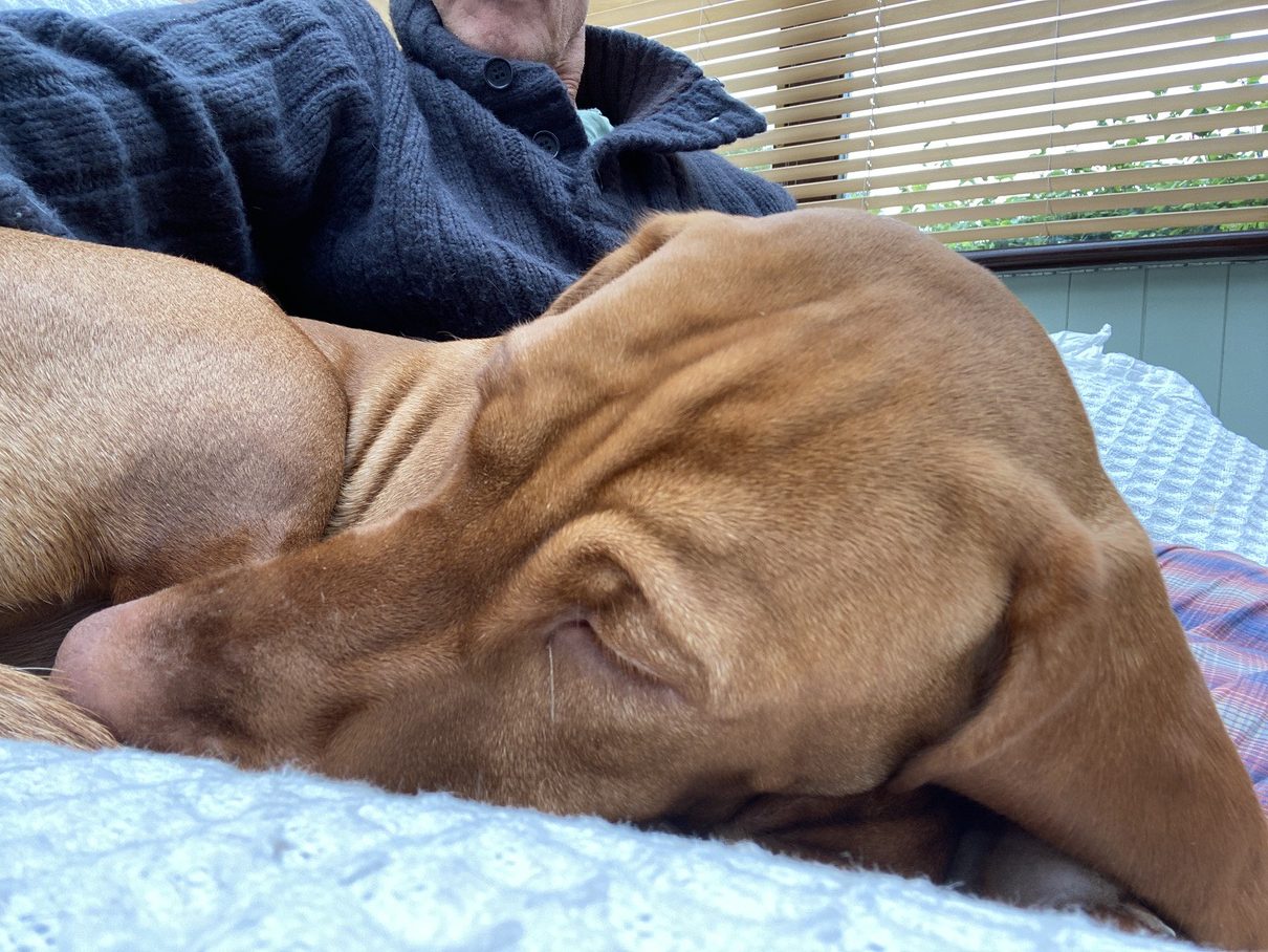 Favourite sleeping times are after breakfast, after the long afternoon walk, after an evening play and chewy session, then finally to bed after the last walk of the day.
