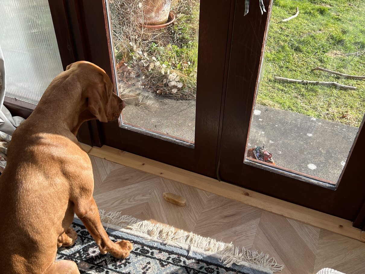 Fergus likes to keep watch through the doors of the conservatory, watching birds and other animals that might drop into our garden.